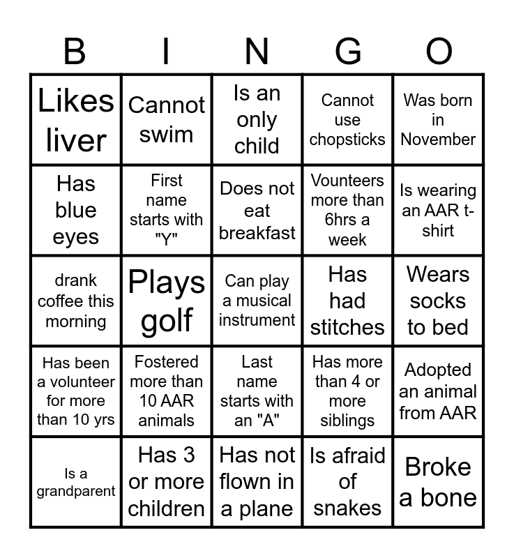 This bingo card has 25 words: Has been a volunteer for more than 10 yrs, Has 3 or more children, Can play a musical instrument, Is afraid of snakes, Was born in November, Likes liver, Cannot swim, Is an only child, Has had stitches, Adopted an animal from AAR, Has blue eyes, First name starts with "Y", Has not flown in a plane, Has more than 4 or more siblings, Is wearing an AAR t-shirt, Is a grandparent, Plays golf, Does not eat breakfast, Vounteers more than 6hrs a week, Wears socks to bed, drank coffee this morning, Fostered more than 10 AAR animals, Last name starts with an "A", Cannot use chopsticks and Broke a bone.