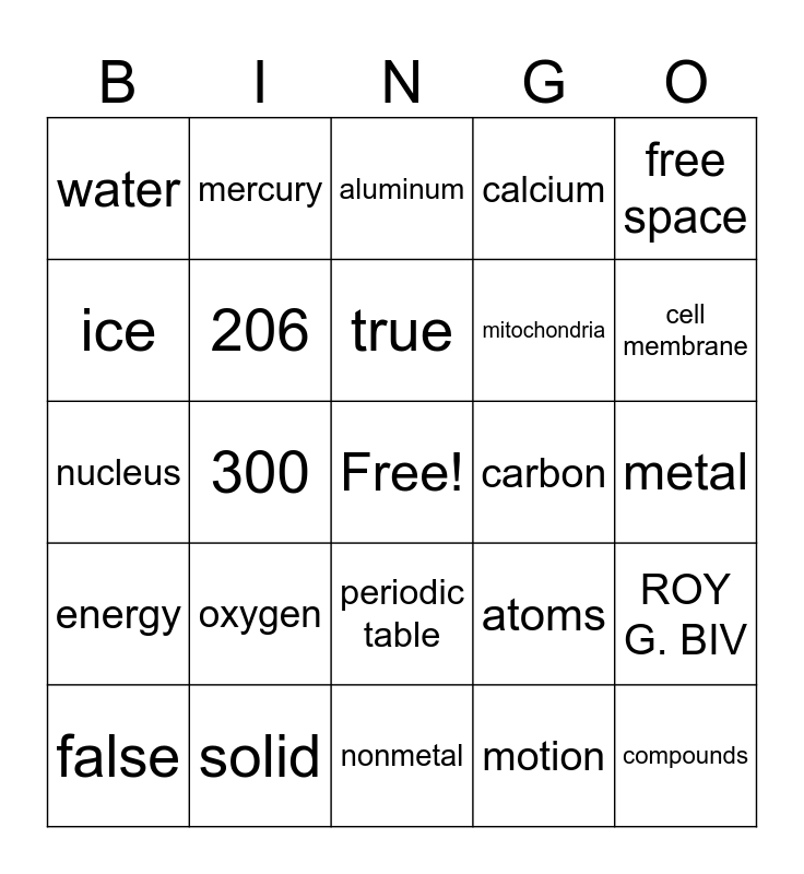 This bingo card has a free space and 24 words: oxygen, solid, true, false, free space, water, ice, mercury, carbon, periodic table, mitochondria, nucleus, atoms, ROY G. BIV, 206, motion, metal, aluminum, cell membrane, 300, compounds, energy, calcium and nonmetal.