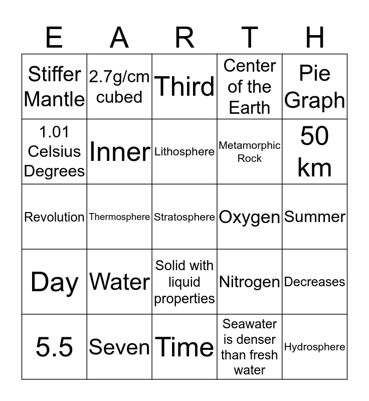 This bingo card has 25 words: Water, Time, Lithosphere, 5.5, Pie Graph, Stiffer Mantle, 1.01 Celsius Degrees, 2.7g/cm cubed, Oxygen, Solid with liquid properties, Metamorphic Rock, Revolution, Nitrogen, Decreases, Inner, Hydrosphere, Summer, Third, 50 km, Thermosphere, Stratosphere, Seven, Day, Center of the Earth and Seawater is denser than fresh water.