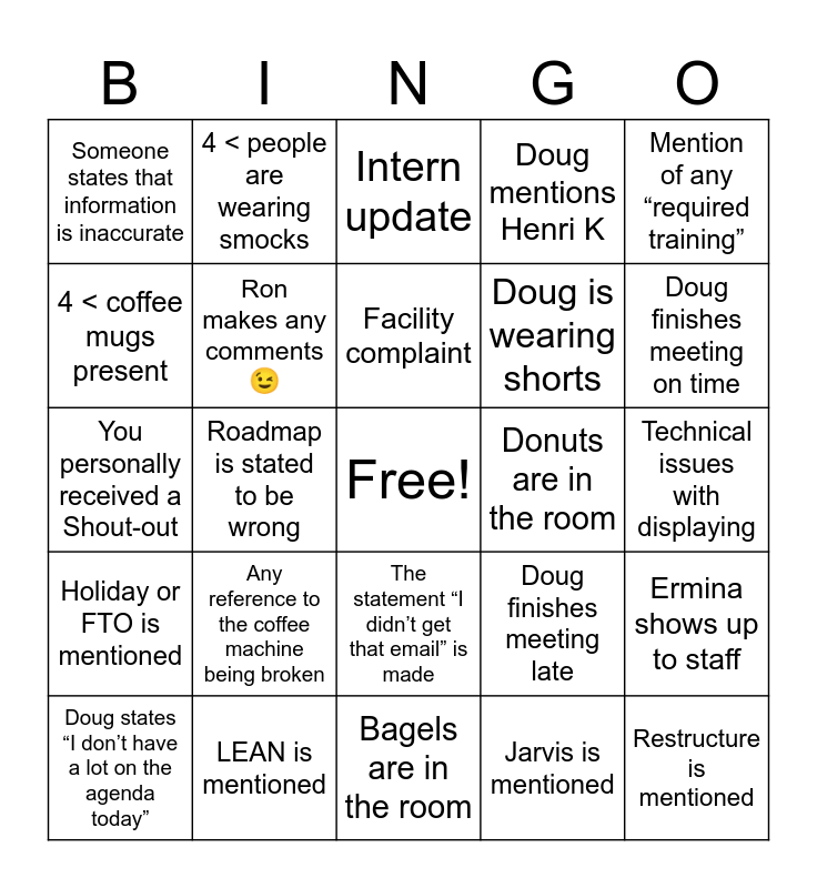 This bingo card has a free space and 30 words: LEAN is mentioned, VCP is mentioned, Roadmap is stated to be wrong, Roundtable is completed, Someone states that information is inaccurate, Intern update, Ron makes any comments đ, The statement âI didnât get that emailâ is made, Donuts are in the room, Bagels are in the room, Technical issues with displaying, Restructure is mentioned, Jarvis is mentioned, Site updates/events mentioned, Doug finishes meeting on time, Doug finishes meeting early, Doug finishes meeting late, Holiday or FTO is mentioned, Any reference to the coffee machine being broken, Mention of any ârequired trainingâ, You personally received a Shout-out, Someone yawns, 4 < people are wearing smocks, Doug is wearing shorts, 4 < coffee mugs present, Doug mentions Henri K, Ermina shows up to staff, Doug states âI donât have a lot on the agenda todayâ, Facility complaint and SARCAMS.