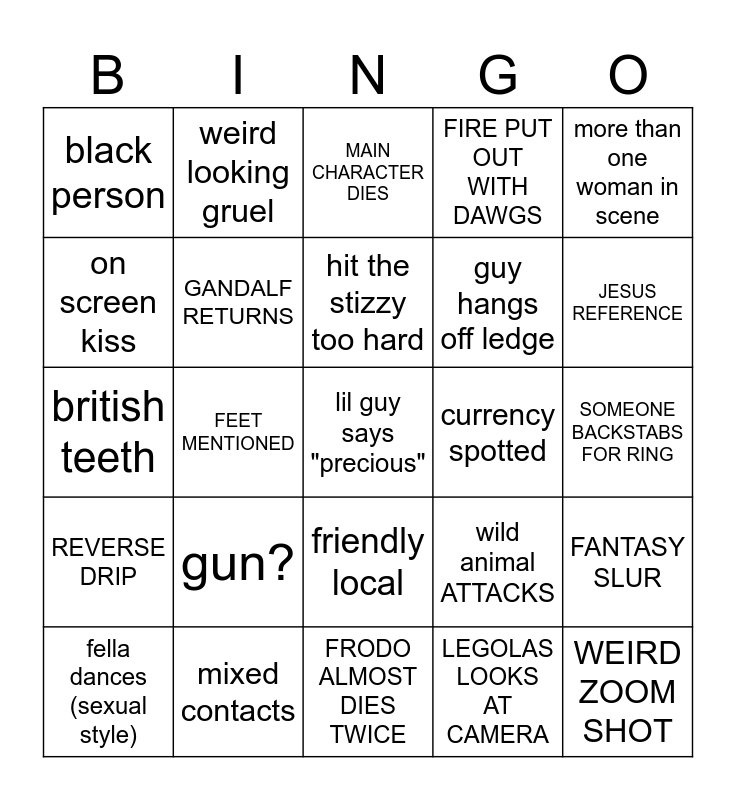 This bingo card has a free space and 24 words: gun?, mixed contacts, hit the stizzy too hard, fella dances (sexual style), more than one woman in scene, black person, on screen kiss, weird looking gruel, currency spotted, friendly local, guy hangs off ledge, british teeth, wild animal ATTACKS, FANTASY SLUR, GANDALF RETURNS, LEGOLAS LOOKS AT CAMERA, SOMEONE BACKSTABS FOR RING, MAIN CHARACTER DIES, JESUS REFERENCE, FEET MENTIONED, WEIRD ZOOM SHOT, REVERSE DRIP, FIRE PUT OUT WITH DAWGS and FRODO ALMOST DIES TWICE.