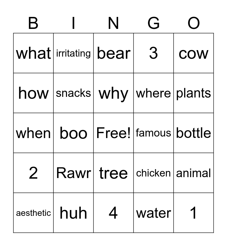 This bingo card has a free space and 24 words: Rawr, huh, why, aesthetic, cow, what, how, irritating, famous, tree, where, when, chicken, animal, snacks, water, bottle, bear, plants, boo, 1, 2, 3 and 4.