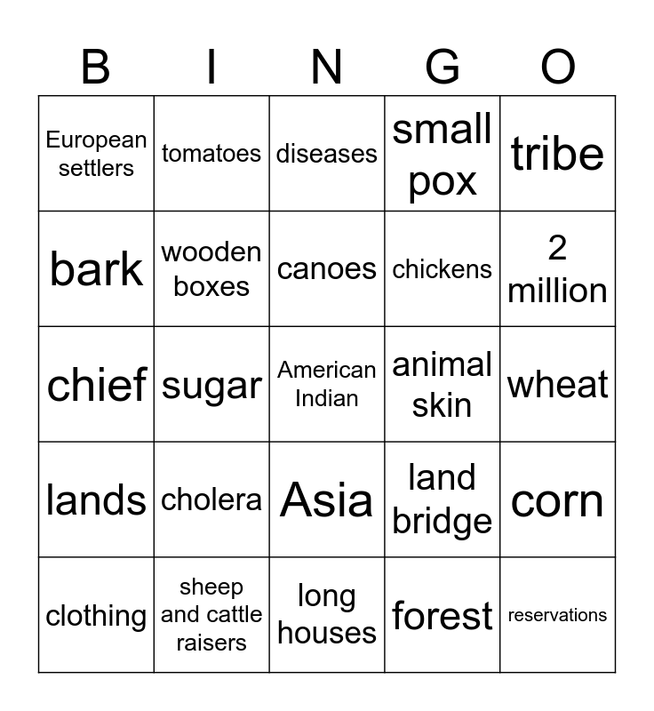 This bingo card has 25 words: lands, sheep and cattle raisers, American Indian, forest, tribe, European settlers, tomatoes, diseases, animal skin, corn, bark, wooden boxes, long houses, land bridge, 2 million, clothing, sugar, canoes, chickens, wheat, chief, cholera, Asia, small pox and reservations.