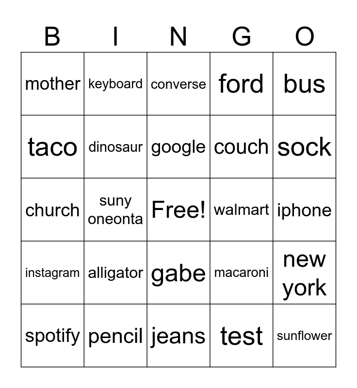 This bingo card has a free space and 24 words: alligator, pencil, google, spotify, bus, mother, taco, keyboard, walmart, gabe, couch, church, macaroni, new york, dinosaur, test, iphone, converse, sock, suny oneonta, sunflower, instagram, ford and jeans.