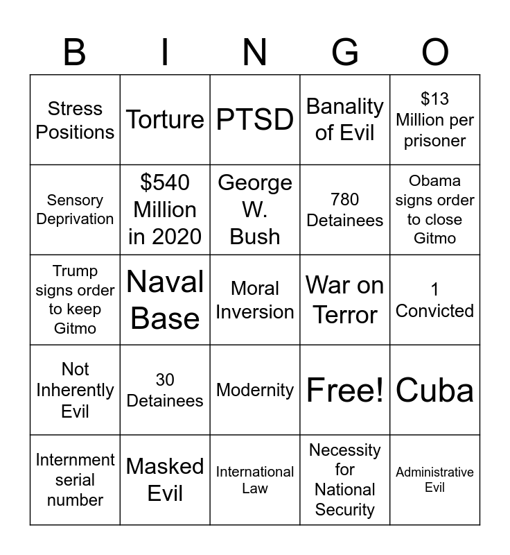 This bingo card has 25 words: 30 Detainees, International Law, George W. Bush, Internment serial number, $13 Million per prisoner, Stress Positions, Sensory Deprivation, Torture, War on Terror, Modernity, 780 Detainees, Trump signs order to keep Gitmo, Free!, Cuba, $540 Million in 2020, Administrative Evil, 1 Convicted, PTSD, Obama signs order to close Gitmo, Naval Base, Moral Inversion, Masked Evil, Not Inherently Evil, Banality of Evil and Necessity for National Security.