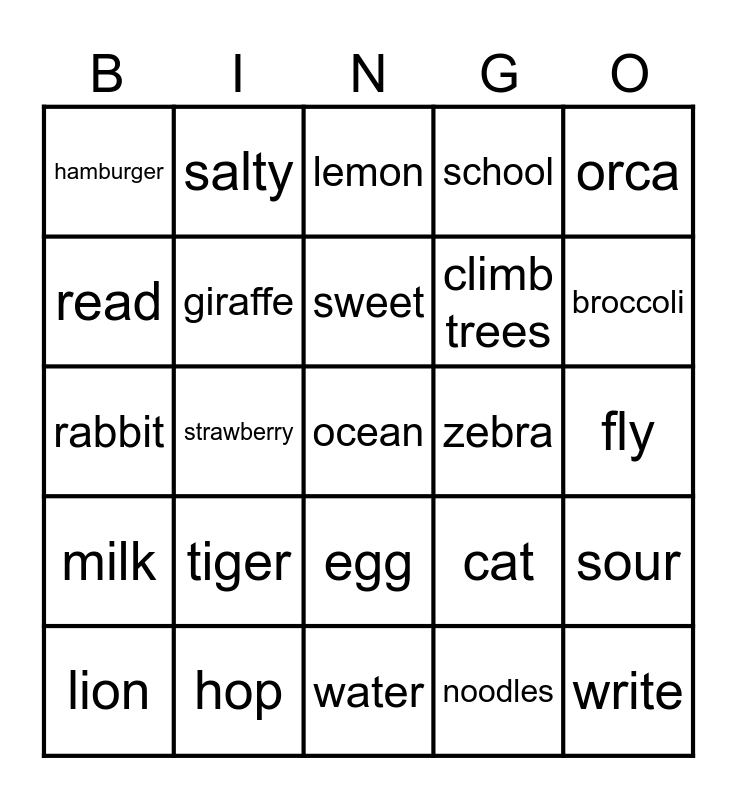 This bingo card has a free space and 29 words: lion, huge, strawberry, elephant, hamburger, lemon, giraffe, tiger, zebra, hop, fly, write, water, noodles, broccoli, bird, egg, milk, orca, rabbit, cat, sharp teeth, climb trees, read, school, salty, sour, sweet and hunt.