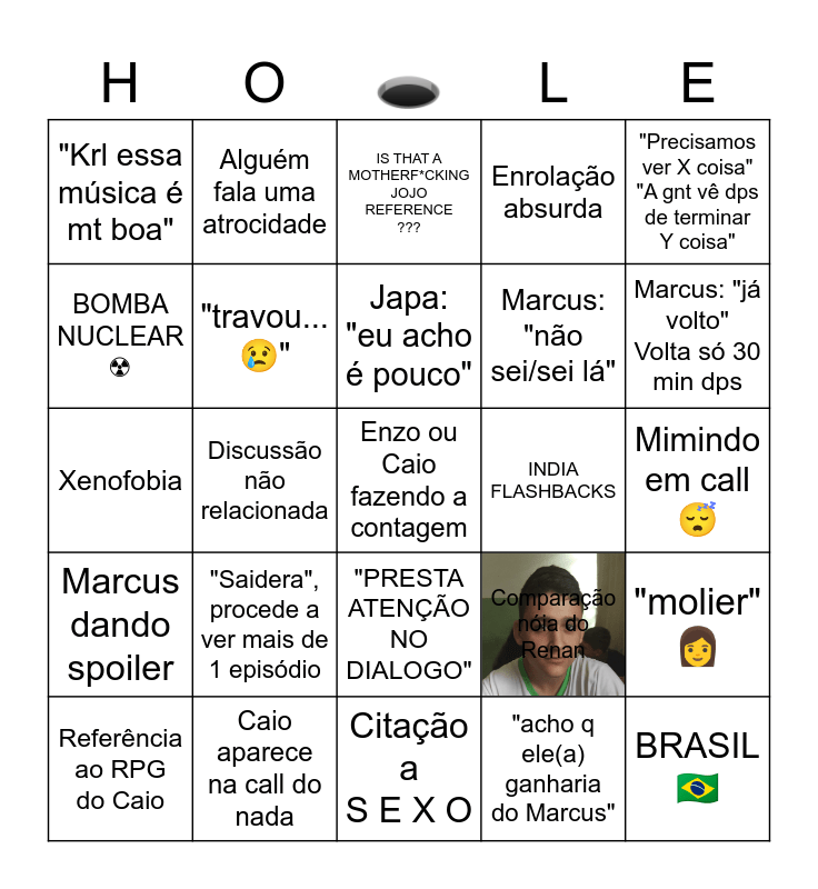 This bingo card has 1 images, a free space and 24 words: "Saidera", procede a ver mais de 1 episódio, Caio aparece na call do nada, Japa: "eu acho é pouco", Referência ao RPG do Caio, "Precisamos ver X coisa" "A gnt vê dps de terminar Y coisa", "Krl essa música é mt boa", BOMBA NUCLEAR ☢, Alguém fala uma atrocidade, INDIA FLASHBACKS, "PRESTA ATENÇÃO NO DIALOGO", Marcus: "não sei/sei lá", Xenofobia, Comparação nóia do Renan, "molier" 👩, "travou... 😢", "acho q ele(a) ganharia do Marcus", Mimindo em call 😴, IS THAT A MOTHERF*CKING JOJO REFERENCE ???, Marcus: "já volto" Volta só 30 min dps, Discussão não relacionada, BRASIL 🇧🇷, Marcus dando spoiler, Enrolação absurda and Citação a S E X O.