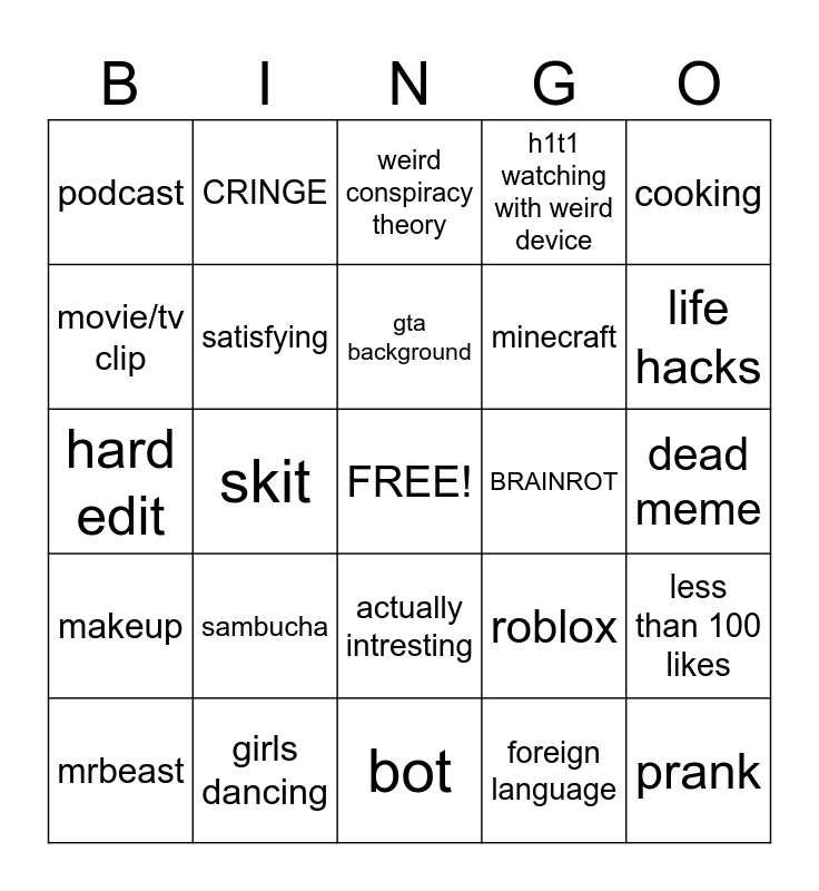 This bingo card has a free space and 24 words: sambucha, girls dancing, gta background, mrbeast, cooking, podcast, movie/tv clip, CRINGE, BRAINROT, actually intresting, minecraft, hard edit, roblox, less than 100 likes, satisfying, foreign language, dead meme, weird conspiracy theory, life hacks, skit, prank, makeup, h1t1 watching with weird device and bot.