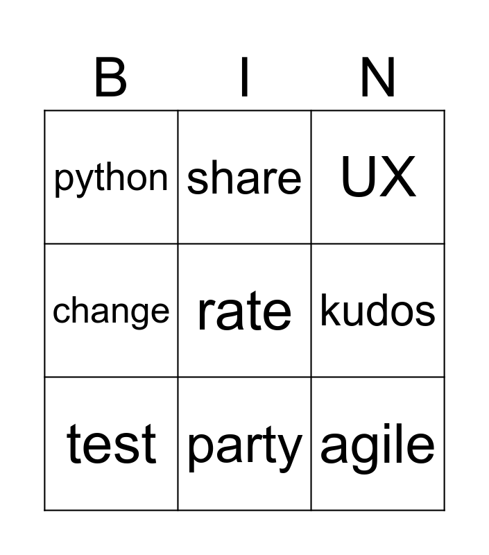 This bingo card has a free space and 8 words: kudos, UX, share, test, python, agile, change and party.