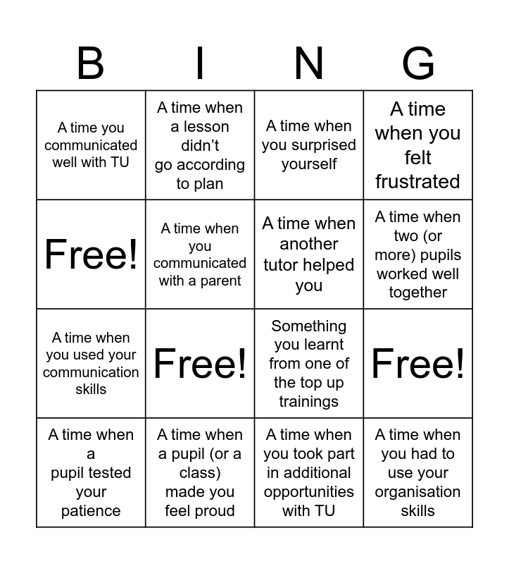 This bingo card has 20 words: Free!, A time when a pupil made you laugh, A time when you surprised yourself, A time when a pupil surprised you, A time when a pupil tested your patience, Free!, A time when a pupil (or a class) made you feel proud, A time you communicated well with TU, A time when you used your communication skills, A time when a lesson didn’t go according to plan, Free!, Something you learnt from one of the top up trainings, A time when you communicated with a parent, A time when you had to use your organisation skills, A time when another tutor helped you, Free!, A time when two (or more) pupils worked well together, A time when you felt frustrated, A time when you took part in additional opportunities with TU and A time you left a lesson feeling happy.