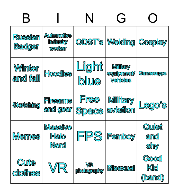 This bingo card has a free space and 24 words: Massive Halo Nerd, VR, Light blue, Cute clothes, Cosplay, Russian Badger, Winter and fall, Automotive industry worker, Military aviation, FPS, Military equipment/ vehicles, Sketching, Femboy, Quiet and shy, Hoodies, Bisexual, Lego’s, ODST’s, Gamersupps, Firearms and gear, Good Kid (band), Memes, Welding and VR photography.