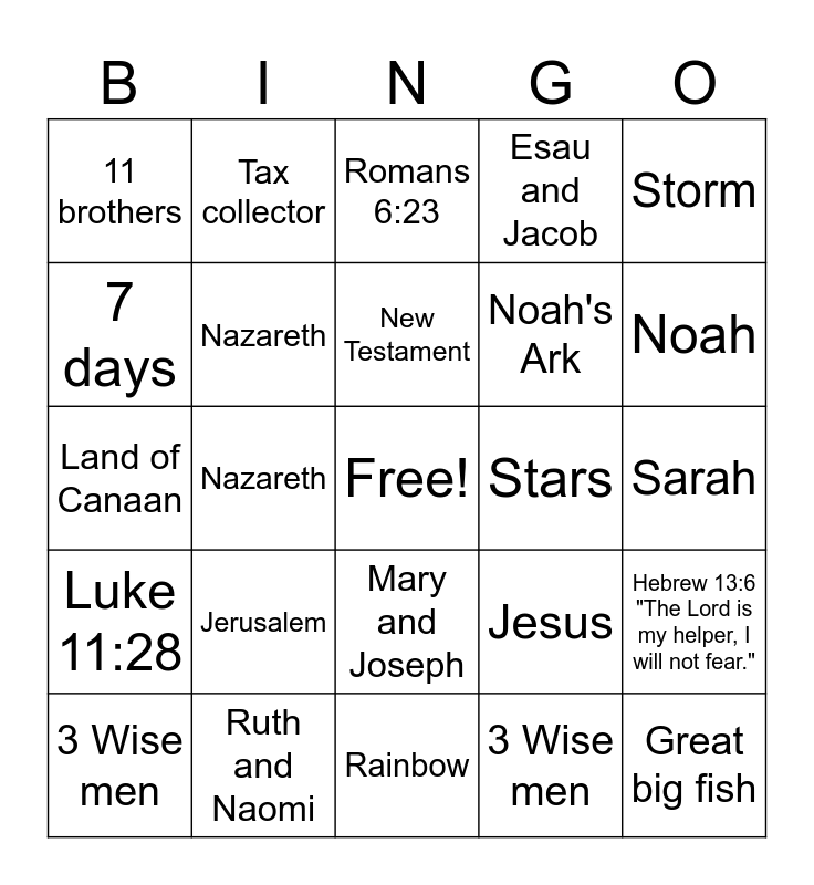 This bingo card has a free space and 197 words: Old Testament, New Testament, God Created Everything, The First Sin, Garden of Eden, Eve, Adam, Noah, 40 days and 40 nights, Noah's Ark, Psalm 119:42 "I trust in Your word.", Rainbow, Abraham, Sarah, Isaac, Rebekah, Esau and Jacob, Land of Canaan, Egypt, Joseph, Coat of many colors, Joseph interprets a Dream, Jonah, Great big fish, Ruth and Naomi, Hebrew 13:6 "The Lord is my helper, I will not fear.", Boaz, Mary and Joseph, Jesus, Bethlehem, Savoir, 3 Wise men, gold, incense, myrrh, Nazareth, Jerusalem, John the Baptist, Jordan River, Matthew, Tax collector, 12 disciples, John 14:6, 1 John 4:11, Luke 11:28, Psalm 34:17, Romans 6:23, 7 days, 11 brothers, Stars, Famine, Storm, Esau and Jacob, Land of Canaan, Egypt, Joseph, Coat of many colors, Joseph interprets a Dream, Jonah, Great big fish, Ruth and Naomi, Hebrew 13:6 "The Lord is my helper, I will not fear.", Boaz, Mary and Joseph, Jesus, Bethlehem, Savoir, 3 Wise men, gold, incense, myrrh, Nazareth, Jerusalem, John the Baptist, Jordan River, Matthew, Tax collector, 12 disciples, John 14:6, 1 John 4:11, Luke 11:28, Psalm 34:17, Romans 6:23, 7 days, 11 brothers, Stars, Famine, Old Testament, New Testament, God Created Everything, The First Sin, Garden of Eden, Eve, Adam, Noah, 40 days and 40 nights, Noah's Ark, Psalm 119:42 "I trust in Your word.", Rainbow, Abraham, Sarah, Isaac, Rebekah, Old Testament, New Testament, God Created Everything, The First Sin, Garden of Eden, Eve, Adam, Noah, 40 days and 40 nights, Esau and Jacob, Land of Canaan, Egypt, Joseph, Coat of many colors, Joseph interprets a Dream, Jonah, Great big fish, Ruth and Naomi, Hebrew 13:6 "The Lord is my helper, I will not fear.", Boaz, Mary and Joseph, Jesus, Bethlehem, Savoir, 3 Wise men, gold, incense, myrrh, Nazareth, Jerusalem, John the Baptist, Jordan River, Noah's Ark, Psalm 119:42 "I trust in Your word.", Rainbow, Abraham, Sarah, Isaac, Rebekah, Matthew, Tax collector, 12 disciples, John 14:6, 1 John 4:11, Luke 11:28, Psalm 34:17, Romans 6:23, 7 days, 11 brothers, Stars, Famine, Old Testament, New Testament, God Created Everything, The First Sin, Garden of Eden, Eve, Adam, Noah, 40 days and 40 nights, Noah's Ark, Tax collector, 12 disciples, John 14:6, 1 John 4:11, Luke 11:28, Psalm 34:17, Romans 6:23, Psalm 119:42 "I trust in Your word.", Rainbow, Abraham, Sarah, Isaac, Rebekah, Esau and Jacob, Land of Canaan, Egypt, Joseph, Coat of many colors, Joseph interprets a Dream, Jonah, Great big fish, Ruth and Naomi, Hebrew 13:6 "The Lord is my helper, I will not fear.", Boaz, Mary and Joseph, Jesus, Bethlehem, Savoir, 3 Wise men, gold, incense, myrrh, Nazareth, Jerusalem, John the Baptist, Jordan River, Matthew, 7 days, 11 brothers, Stars and Famine.
