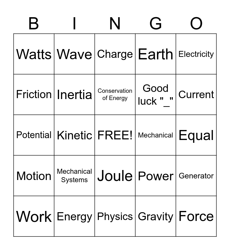 This bingo card has a free space and 24 words: Mechanical Systems, Energy, Conservation of Energy, Work, Electricity, Watts, Friction, Wave, Mechanical, Joule, Good luck "_", Potential, Power, Generator, Inertia, Gravity, Equal, Charge, Current, Kinetic, Force, Motion, Earth and Physics.