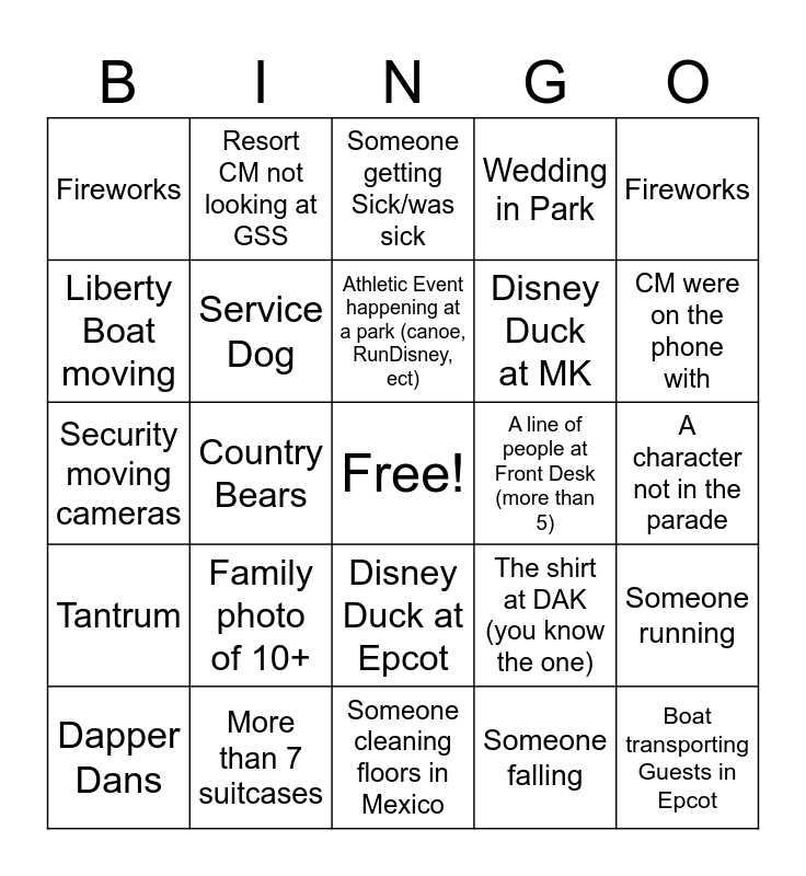 ⚠ This card has duplicate items: Athletic Event happening at a park (canoe, RunDisney, ect) (2), Wedding in Park (2), Fireworks (3), Parade (2), Dapper Dans (3), Free Space (3), Tantrum (3), Couple Fighting (2), The shirt at DAK (you know the one) (2), Scooter parade (3+ scooters) (3), More than 7 suitcases (3), Someone running (3), Service Dog (2), A character not in the parade (2), Country Bears (2), Resort CM not looking at GSS (2), Someone cleaning floors in Mexico (2), Liberty Boat moving (2), Boat transporting Guests in Epcot (2), A line of people at Front Desk (more than 5) (2), Someone falling (2), Family photo of 10+ (2), Tequilla B-Line (2), Squirrel or Bunny (2), Disney Duck at Epcot (2), Disney Duck at MK (2), Someone getting Sick/was sick (2), Janitor paining with water (2), Flag going up at MK (2), Security moving cameras (2), CM were on the phone with (2), Universal Merch (thing 1/thing 2, minion, HP, Ect) (2), 3 lightsabers on screen (2)