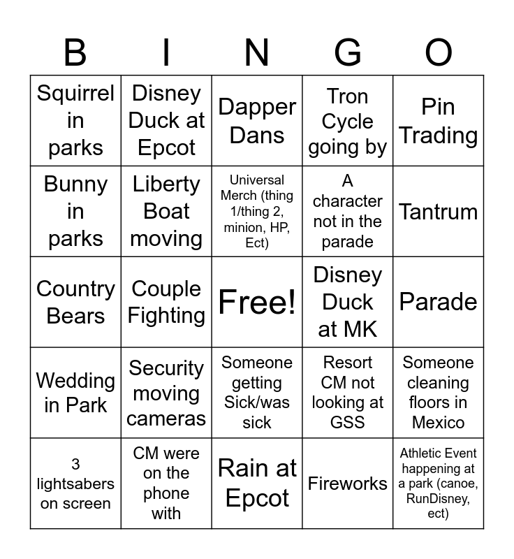 This bingo card has a free space and 24 words: Security moving cameras, CM were on the phone with, Universal Merch (thing 1/thing 2, minion, HP, Ect), 3 lightsabers on screen, Pin Trading, Squirrel in parks, Bunny in parks, Disney Duck at Epcot, Disney Duck at MK, Someone getting Sick/was sick, A character not in the parade, Country Bears, Resort CM not looking at GSS, Someone cleaning floors in Mexico, Liberty Boat moving, Fireworks, Parade, Dapper Dans, Tantrum, Couple Fighting, Athletic Event happening at a park (canoe, RunDisney, ect), Wedding in Park, Tron Cycle going by and Rain at Epcot.