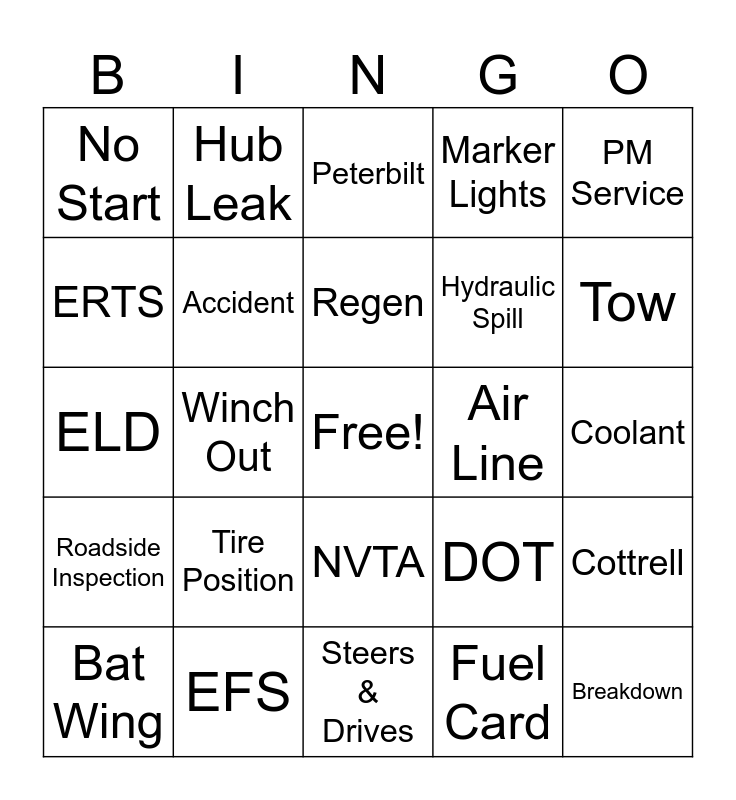 This bingo card has a free space and 24 words: Tire Position, EFS, Regen, Bat Wing, PM Service, No Start, ERTS, Hub Leak, Air Line, NVTA, Hydraulic Spill, ELD, DOT, Cottrell, Accident, Fuel Card, Coolant, Peterbilt, Tow, Winch Out, Breakdown, Roadside Inspection, Marker Lights and Steers & Drives.