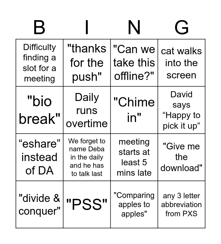 This bingo card has 16 words: "PSS", "Give me the download", "Can we take this offline?", Difficulty finding a slot for a meeting, “eshare” instead of DA, "thanks for the push", meeting starts at least 5 mins late, "Comparing apples to apples", "bio break", Daily runs overtime, "divide & conquer", cat walks into the screen, We forget to name Deba in the daily and he has to talk last, David says “Happy to pick it up”, "Chime in" and any 3 letter abbreviation from PXS.
