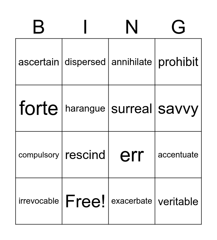 This bingo card has 16 words: Free!, accentuate, annihilate, ascertain, compulsory, dispersed, err, exacerbate, forte, harangue, irrevocable, prohibit, rescind, savvy, surreal and veritable.