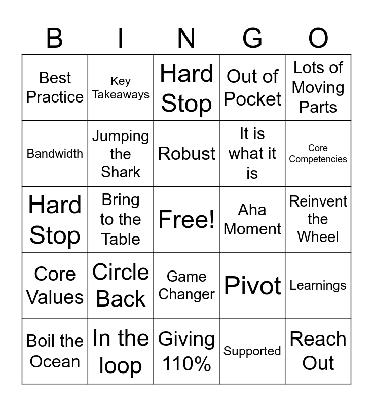 This bingo card has a free space and 24 words: Circle Back, In the loop, Robust, Boil the Ocean, Lots of Moving Parts, Best Practice, Bandwidth, Key Takeaways, Aha Moment, Game Changer, It is what it is, Hard Stop, Pivot, Learnings, Jumping the Shark, Supported, Reinvent the Wheel, Hard Stop, Core Competencies, Bring to the Table, Reach Out, Core Values, Out of Pocket and Giving 110%.