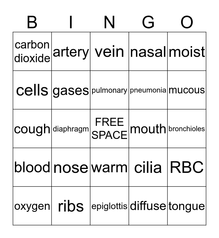 This bingo card has a free space and 33 words: lungs, voice box, diaphragm, air, blood, gases, moist, oxygen, artery, alveoli, pulmonary, vein, trachea, capillary, mouth, mucous, ribs, cough, nose, cilia, warm, larynx, carbon dioxide, bronchioles, epiglottis, tongue, nasal, pneumonia, cells, RBC, hemoglobin, diffuse and exchange.