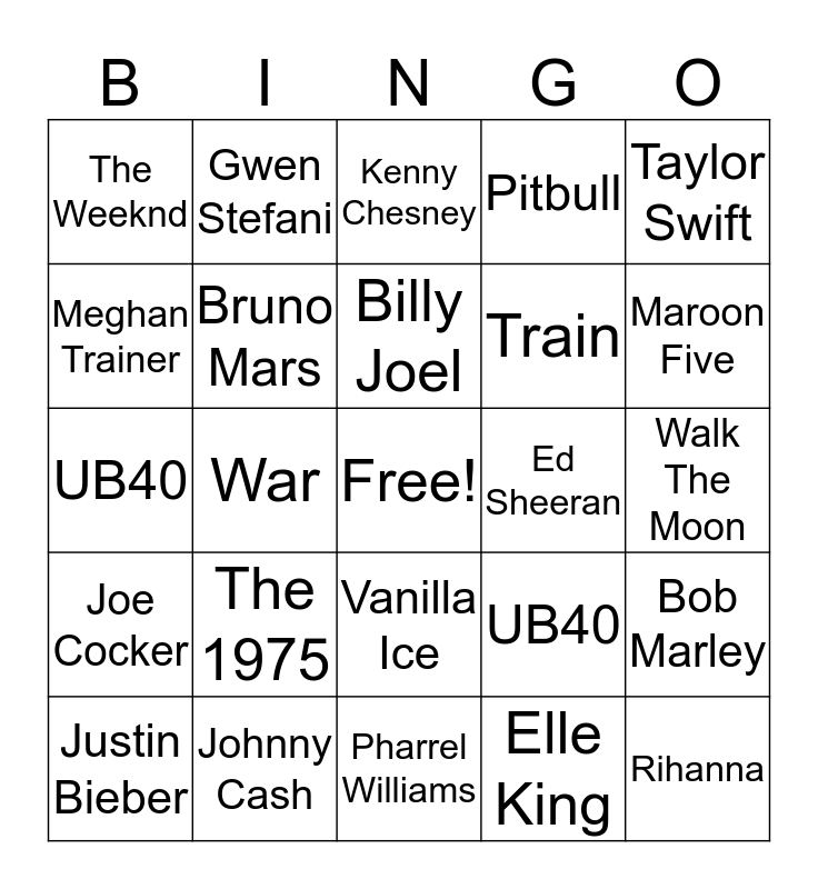 This bingo card has a free space and 24 words: The 1975, Johnny Cash, Billy Joel, Justin Bieber, Taylor Swift, The Weeknd, Meghan Trainer, Gwen Stefani, Ed Sheeran, Vanilla Ice, Train, UB40, UB40, Bob Marley, Bruno Mars, Elle King, Walk The Moon, Kenny Chesney, Maroon Five, War, Rihanna, Joe Cocker, Pitbull and Pharrel Williams.