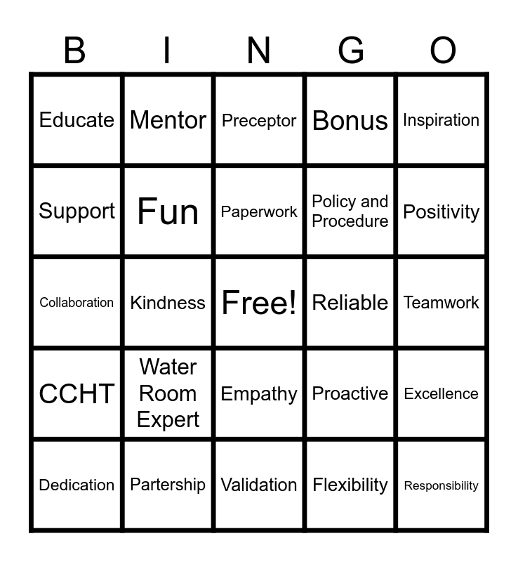 This bingo card has a free space and 25 words: Water Room Expert, Validation, Paperwork, Dedication, Inspiration, Educate, Support, Mentor, Reliable, Empathy, Policy and Procedure, Collaboration, Proactive, Excellence, Fun, Fresenius, Teamwork, Preceptor, Positivity, Kindness, Responsibility, Partership, CCHT, Bonus and Flexibility.