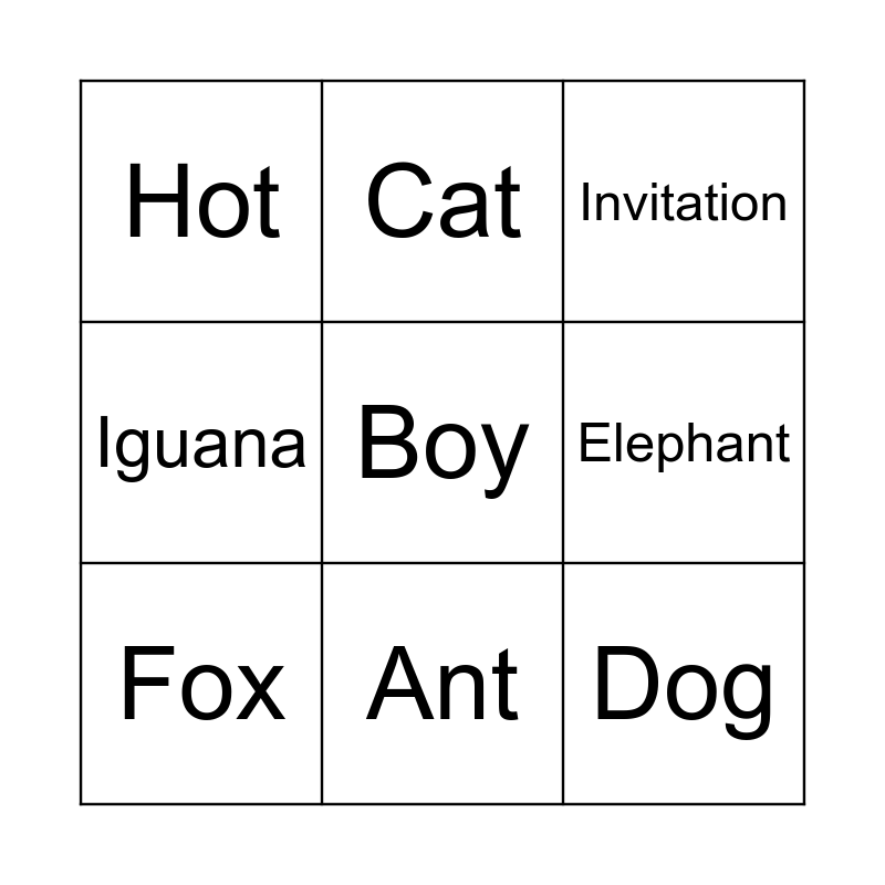 This bingo card has a free space and 19 words: Alligator, Igloo, Invitation, Apple, Octopus, Dog, Elegant, Hot, Cat, Insect, Mom, Elephant, Fox, Injection, Egg, Top, Iguana, Ant and Ostrich.