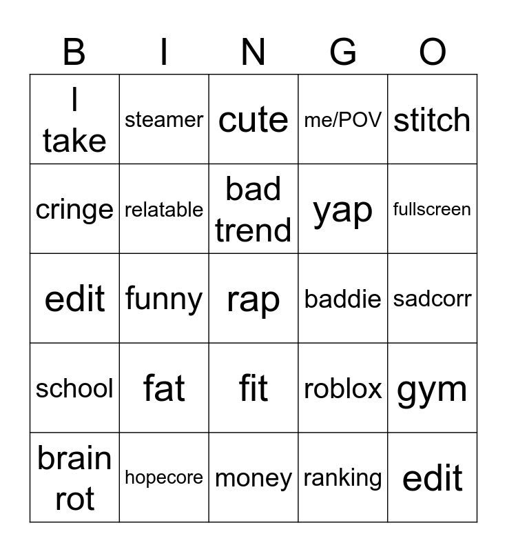 This bingo card has a free space and 24 words: brain rot, fat, bad trend, ranking, stitch, l take, steamer, cute, baddie, sadcorr, edit, relatable, roblox, gym, cringe, hopecore, money, me/POV, fullscreen, school, funny, fit, yap and edit.
