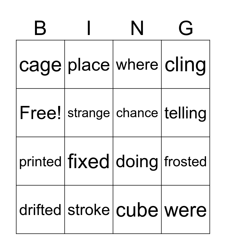 This bingo card has 16 words: stroke, frosted, where, cage, printed, place, doing, cube, Free!, strange, drifted, cling, fixed, telling, chance and were.