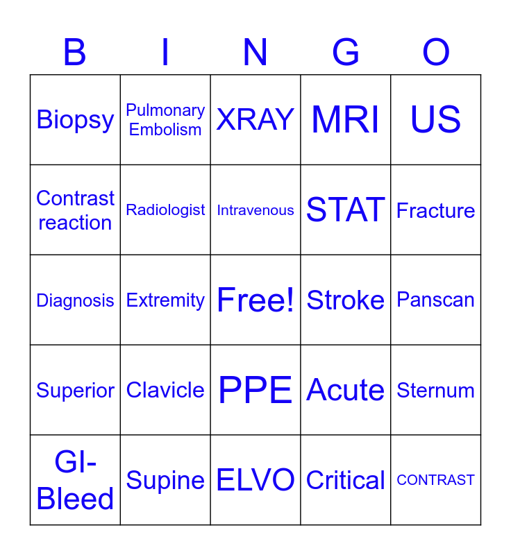 This bingo card has a free space and 34 words: CT, Critical, Chronic, VIR, Superior, Radiologist, US, GI- Bleed, Pulmonary Embolism, Pelvis, Intravenous, XRAY, Artifact, EMR, Stroke, Fracture, Supine, Diagnosis, Clavicle, Acute, PPE, Femur, Biopsy, Panscan, ELVO, CONTRAST, MRI, INPATIENT, STAT, Contrast reaction, Infection control, Extremity, Sternum and Prone.