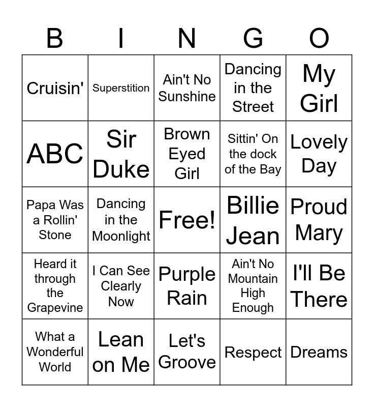 This bingo card has a free space and 24 words: I Can See Clearly Now, Lean on Me, Brown Eyed Girl, What a Wonderful World, My Girl, Cruisin', ABC, Superstition, Billie Jean, Purple Rain, Sittin' On the dock of the Bay, Papa Was a Rollin' Stone, Ain't No Mountain High Enough, I'll Be There, Sir Duke, Respect, Proud Mary, Ain't No Sunshine, Lovely Day, Dancing in the Moonlight, Dreams, Heard it through the Grapevine, Dancing in the Street and Let's Groove.