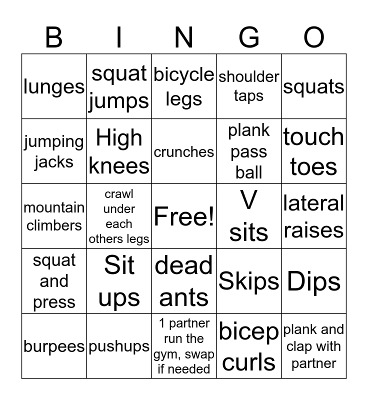This bingo card has a free space and 24 words: Sit ups, pushups, crunches, burpees, squats, lunges, jumping jacks, squat jumps, V sits, dead ants, plank pass ball, mountain climbers, Skips, Dips, High knees, bicep curls, lateral raises, bicycle legs, touch toes, crawl under each others legs, plank and clap with partner, squat and press, shoulder taps and 1 partner run the gym, swap if needed.