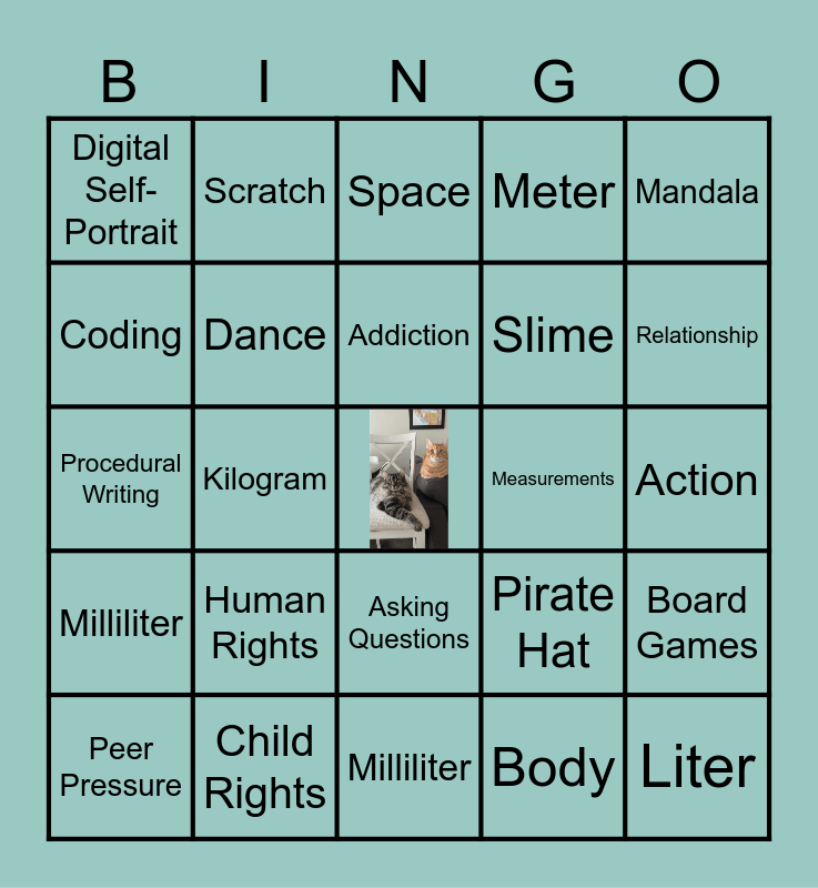 This bingo card has a free space and 24 words: Human Rights, Child Rights, Addiction, Peer Pressure, Mandala, Digital Self-Portrait, Coding, Scratch, Measurements, Asking Questions, Slime, Procedural Writing, Pirate Hat, Board Games, Dance, Body, Action, Space, Relationship, Kilogram, Liter, Milliliter, Meter and Milliliter.