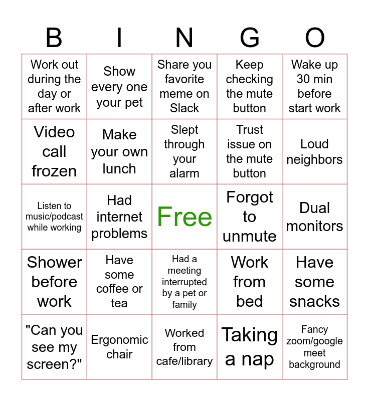 This bingo card has a free space and 24 words: "Can you see my screen?", Have some coffee or tea, Slept through your alarm, Taking a nap, Wake up 30 min before start work, Work out during the day or after work, Show every one your pet, Share you favorite meme on Slack, Forgot to unmute, Dual monitors, Listen to music/podcast while working, Make your own lunch, Work from bed, Have some snacks, Video call frozen, Ergonomic chair, Worked from cafe/library, Keep checking the mute button, Loud neighbors, Shower before work, Had internet problems, Had a meeting interrupted by a pet or family, Trust issue on the mute button and Fancy zoom/google meet background.