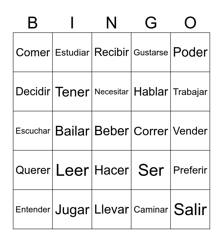 This bingo card has a free space and 24 words: Leer, Jugar, Necesitar, Entender, Poder, Comer, Decidir, Estudiar, Correr, Hacer, Hablar, Escuchar, Ser, Preferir, Tener, Caminar, Vender, Recibir, Trabajar, Bailar, Salir, Querer, Gustarse and Llevar.