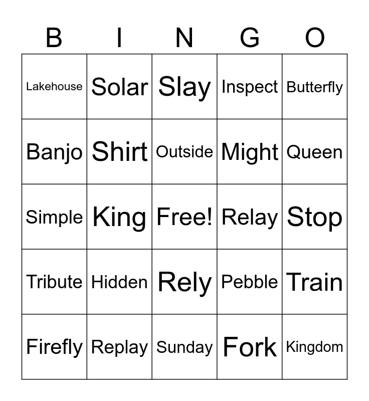 This bingo card has a free space and 24 words: Hidden, Replay, Outside, Firefly, Butterfly, Lakehouse, Banjo, Solar, Relay, Rely, Might, Simple, Pebble, Train, Shirt, Fork, Stop, Slay, Queen, King, Kingdom, Tribute, Inspect and Sunday.