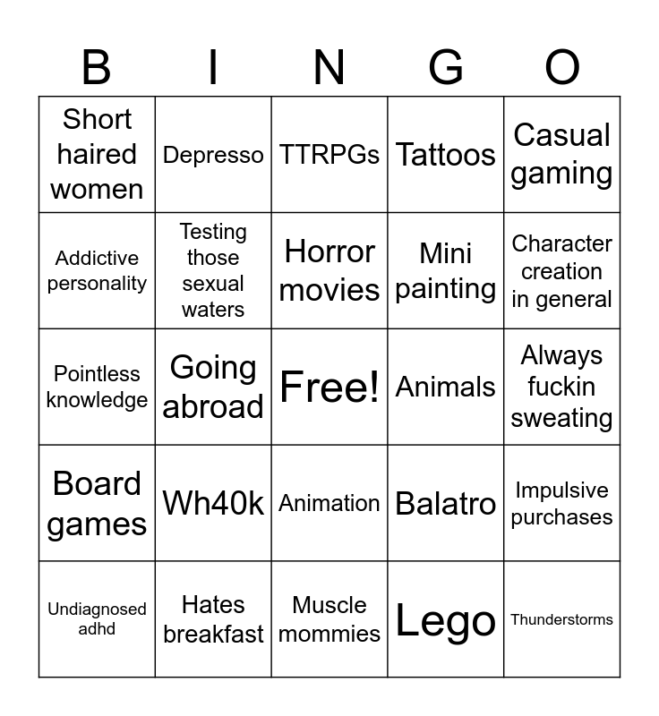 This bingo card has a free space and 24 words: Wh40k, Hates breakfast, Horror movies, Undiagnosed adhd, Casual gaming, Short haired women, Addictive personality, Depresso, Animals, Animation, Mini painting, Pointless knowledge, Balatro, Impulsive purchases, Testing those sexual waters, Lego, Always fuckin sweating, TTRPGs, Character creation in general, Going abroad, Thunderstorms, Board games, Tattoos and Muscle mommies.