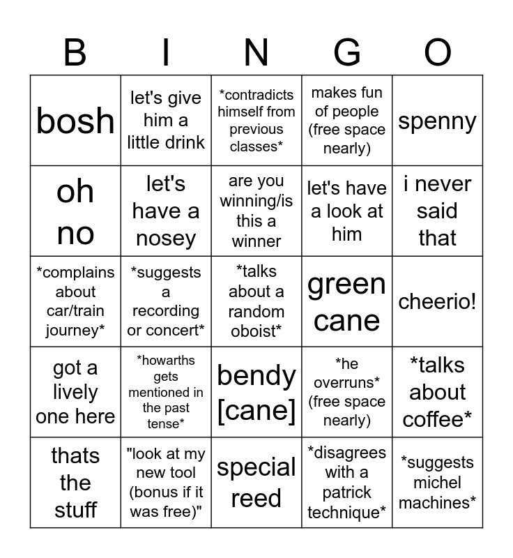 This bingo card has 25 words: *howarths gets mentioned in the past tense*, special reed, are you winning/is this a winner, thats the stuff, spenny, bosh, oh no, let's give him a little drink, green cane, bendy [cane], let's have a look at him, *complains about car/train journey*, *he overruns* (free space nearly), *talks about coffee*, let's have a nosey, *suggests michel machines*, cheerio!, *contradicts himself from previous classes*, i never said that, *suggests a recording or concert*, *talks about a random oboist*, "look at my new tool (bonus if it was free)", got a lively one here, makes fun of people (free space nearly) and *disagrees with a patrick technique*.