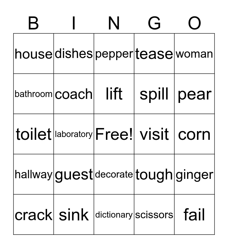 This bingo card has a free space and 24 words: guest, sink, lift, crack, woman, house, bathroom, dishes, visit, decorate, spill, toilet, tough, ginger, coach, scissors, corn, pepper, pear, laboratory, fail, hallway, tease and dictionary.