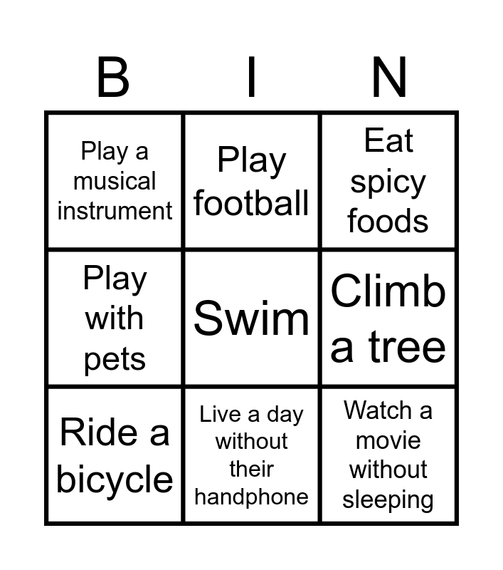 This bingo card has 9 words: Ride a bicycle, Eat spicy foods, Play football, Play with pets, Play a musical instrument, Climb a tree, Swim, Watch a movie without sleeping and Live a day without their handphone.
