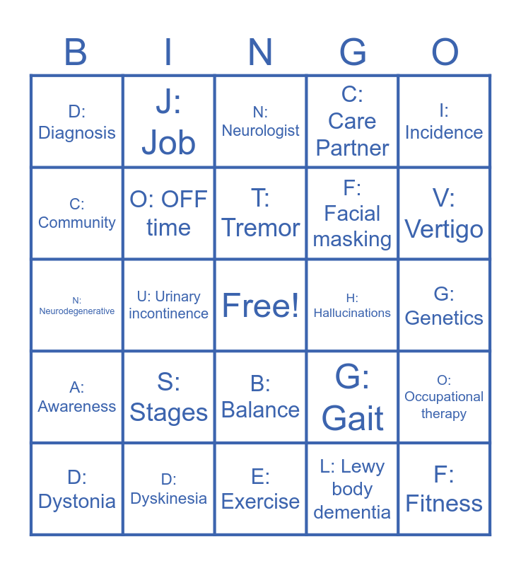 This bingo card has a free space and 54 words: A: Anxiety, A: Awareness, A: Advocacy, A: Akinesia, B: Balance, B: Bradykinesia, C: Care Partner, C: Cognition, C: Community, C: Carbidopa, D: Diagnosis, D: Dopamine, D: Dyskinesia, D: Dystonia, E: Early Signs, E: Exercise, F: Fitness, F: Facial masking, F: Freezing, G: Genetics, G: Gait, H: Hospital Safety, H: Hallucinations, I: Incidence, I: Idiopathic, J: Job, J: Jaw tremor, K: Knowledge, K: Kinetics, L: Lewy body dementia, L: Levodopa, M: Motor fluctuations, M: Movement disorder, M: Motor symptoms, N: Neurologist, N: Non-motor symptoms, N: Neurodegenerative, O: Occupational therapy, O: ON time, O: OFF time, P: Parkinsonism, P: Physical therapy, R: Research, R: Rigidity, S: Stages, S: Support, S: Shuffling, S: Stiffness, T: Tremor, U: Urinary incontinence, V: Vertigo, V: Voice changes, Y: Young-onset Parkinson’s and Z: Zzzz (sleep disturbances).