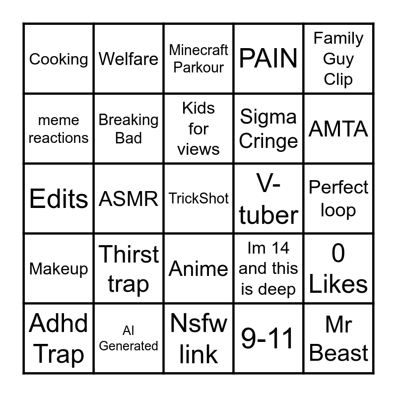 This bingo card has 25 words: Thirst trap, Nsfw link, Kids for views, Adhd Trap, Family Guy Clip, Cooking, meme reactions, Welfare, V-tuber, Anime, Sigma Cringe, Edits, Im 14 and this is deep, 0 Likes, Breaking Bad, Mr Beast, Perfect loop, Minecraft Parkour, AMTA, ASMR, TrickShot, AI Generated, Makeup, PAIN and 9-11.