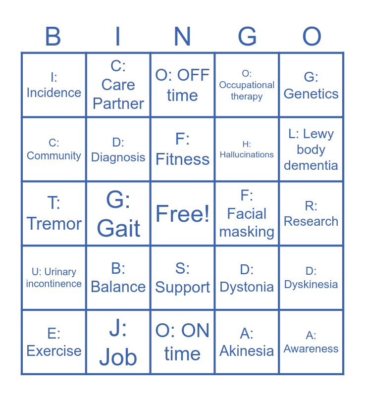 This bingo card has a free space and 53 words: A: Anxiety, A: Awareness, A: Advocacy, A: Akinesia, B: Balance, B: Bradykinesia, C: Care Partner, C: Cognition, C: Community, C: Carbidopa, D: Diagnosis, D: Dopamine, D: Dyskinesia, D: Dystonia, E: Early Signs, E: Exercise, F: Fitness, F: Facial masking, F: Freezing, G: Genetics, G: Gait, H: Hospital Safety, H: Hallucinations, I: Incidence, I: Idiopathic, J: Job, J: Jaw tremor, K: Knowledge, K: Kinetics, L: Lewy body dementia, L: Levodopa, M: Motor fluctuations, M: Motor symptoms, N: Neurologist, N: Non-motor symptoms, N: Neurodegenerative, O: Occupational therapy, O: ON time, O: OFF time, P: Parkinsonism, P: Physical therapy, P: Posture, R: Research, R: Rigidity, S: Stages, S: Support, S: Shuffling, S: Stiffness, T: Tremor, U: Urinary incontinence, V: Vertigo, V: Voice changes and Z: Zzzz (sleep disturbances).
