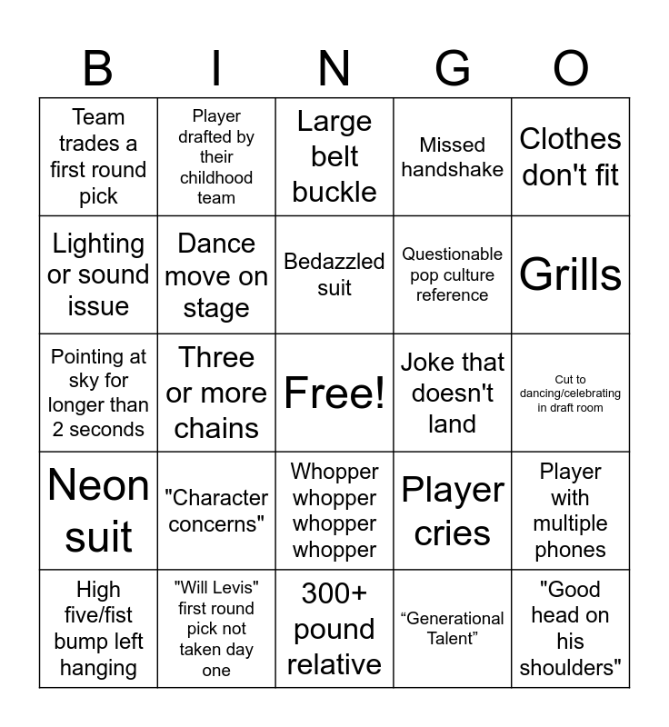 This bingo card has a free space and 36 words: Thank god, Sad mom story, Sad dad story, Dance move on stage, Player cries, Neon suit, Bedazzled suit, Hat doesn't fit, Clothes don't fit, No shirt/exposed clavicle, Three or more chains, Missed handshake, Goodell references boos, Joke that doesn't land, Grills, Team trades a first round pick, Sad sibling story, "Character concerns", "Good head on his shoulders", Large belt buckle, Cut to dancing/celebrating in draft room, Player with multiple phones, "Will Levis" first round pick not taken day one, High five/fist bump left hanging, 300+ pound relative, Player drafted by their childhood team, Pointing at sky for longer than 2 seconds, Spilled food or drink, Questionable pop culture reference, Lighting or sound issue, Trip/stumble, Goodell name mispronunciation, “Generational Talent”, Whopper whopper whopper whopper, Caitlin Clark reference and “Papa Bear Halas”.