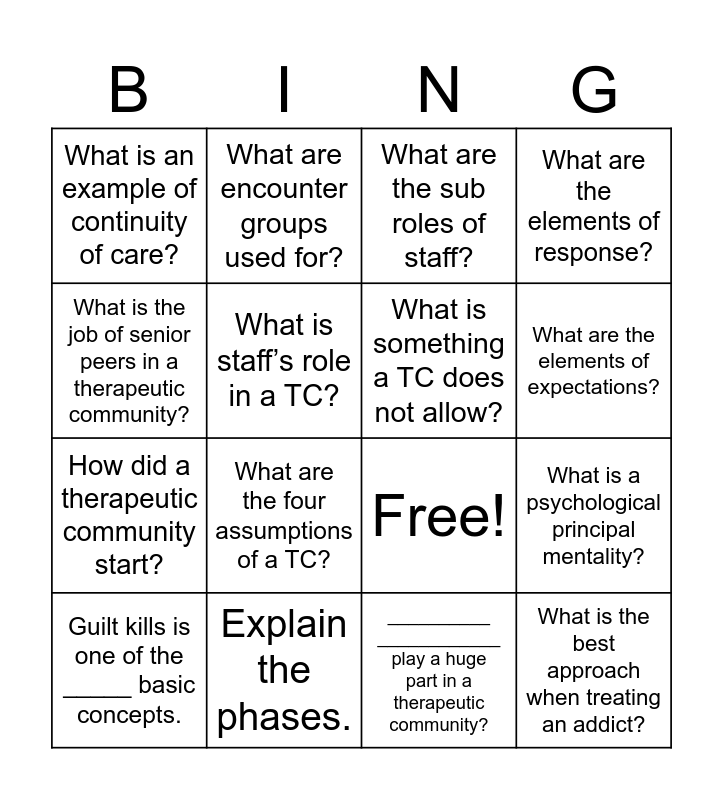 This bingo card has 21 words: Explain the phases., What is the role of expediting?, What are encounter groups used for?, What is something a TC does not allow?, __________ ____________ play a huge part in a therapeutic community?, What is something a TC does not allow?, What is an example of continuity of care?, What are the sub roles of staff?, Free!, What are the elements of expectations?, How did a therapeutic community start?, What are the elements of response?, What is the best approach when treating an addict?, Why are TC’s completely planned/full of structure?, What is staff’s role in a TC?, What is the quality most addicts struggle with?, Guilt kills is one of the _____ basic concepts., What are the four assumptions of a TC?, What is the job of senior peers in a therapeutic community?, What is a psychological principal mentality? and What does a TC teach for managing frustration?.