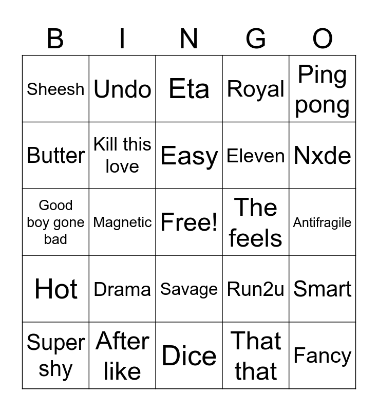 This bingo card has a free space and 29 words: Super shy, Cheers, Magnetic, Icky, Sheesh, Eta, Kill this love, Drama, The feels, After like, Antifragile, Fancy, Dice, That that, Nxde, Maniac, Savage, Hot, Ping pong, Good boy gone bad, Run2u, Love dive, Eleven, Butter, Royal, Undo, Smart, Easy and Deja vu.