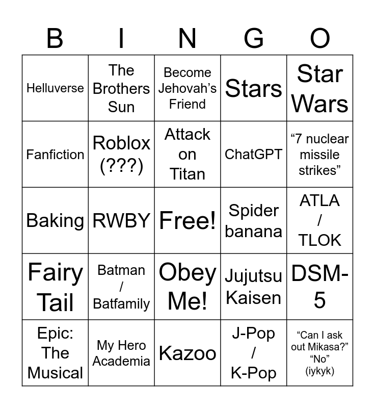 This bingo card has a free space and 24 words: Batman / Batfamily, My Hero Academia, Attack on Titan, Epic: The Musical, Star Wars, Helluverse, Fanfiction, The Brothers Sun, Spider banana, Obey Me!, ChatGPT, Baking, Jujutsu Kaisen, DSM-5, Roblox (???), J-Pop / K-Pop, ATLA / TLOK, Become Jehovah’s Friend, “7 nuclear missile strikes”, RWBY, “Can I ask out Mikasa?” “No” (iykyk), Fairy Tail, Stars and Kazoo.
