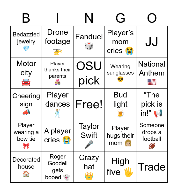 This bingo card has a free space and 24 words: A player cries π, Roger Goodell gets booed π», OSU pick, Decorated house π , JJ, Bedazzled jewelry π, Motor city π, Drone footage π, Bud light πΊ, Taylor Swift π€, Wearing sunglasses π, Cheering sign π£, Player hugs their mom π©πΌ, Someone drops a football π, Player thanks their parents π©πΌββ€οΈβπ¨π½, High five ποΈ, βThe pick is in!β π’, Fanduel π², National Anthem πΊπΈ, Player dances πΊπΌ, Trade, Player wearing a bow tie π, Playerβs mom cries π and Crazy hat π.