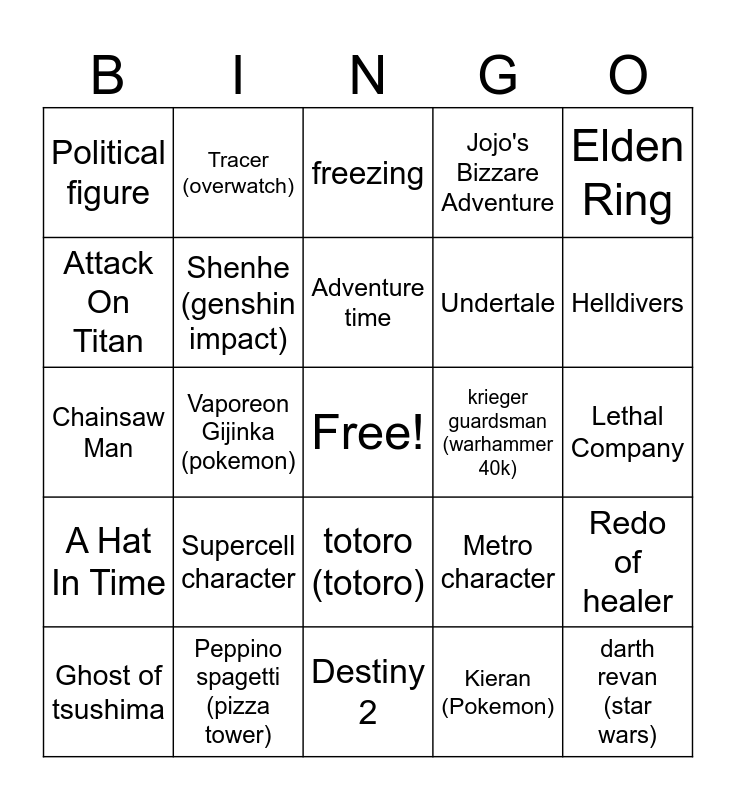 This bingo card has a free space and 24 words: Supercell character, Peppino spagetti (pizza tower), Adventure time, Ghost of tsushima, Elden Ring, Political figure, Attack On Titan, Tracer (overwatch), krieger guardsman (warhammer 40k), totoro (totoro), Undertale, Chainsaw Man, Metro character, Redo of healer, Shenhe (genshin impact), Kieran (Pokemon), Lethal Company, freezing, Helldivers, Vaporeon Gijinka (pokemon), darth revan (star wars), A Hat In Time, Jojo's Bizzare Adventure and Destiny 2.