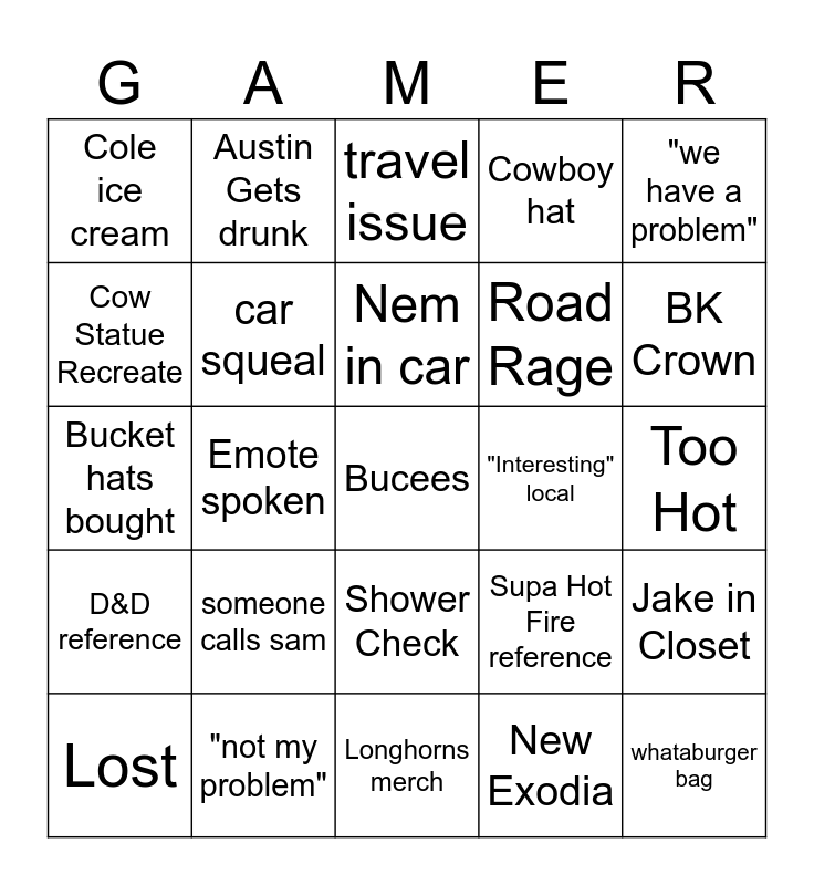 This bingo card has a free space and 24 words: someone calls sam, "not my problem", Nem in car, Lost, "we have a problem", Cole ice cream, Cow Statue Recreate, Austin Gets drunk, "Interesting" local, Shower Check, Road Rage, Bucket hats bought, Supa Hot Fire reference, Jake in Closet, car squeal, New Exodia, Too Hot, travel issue, BK Crown, Emote spoken, whataburger bag, D&D reference, Cowboy hat and Longhorns merch.